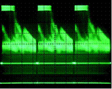 圖2是無Z軸亮度調(diào)制較老數(shù)字示波器的顯示。雖然該示波器甚至在5ms/div時(shí)仍有捕獲信號(hào)細(xì)節(jié)的足夠采樣率和存儲(chǔ)器深度但所有捕獲點(diǎn)的顯示亮度相同。這就在視覺上丟失了信號(hào)包絡(luò)內(nèi)的波形細(xì)節(jié)。因此在選擇模擬示波器技術(shù)還是選擇較老的數(shù)字顯示技術(shù)上不應(yīng)對(duì)今天視頻實(shí)驗(yàn)室中充斥模擬示波器感到驚奇!