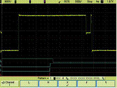 當(dāng)您觀察復(fù)合調(diào)制模擬信號(hào)如前述組合電視信號(hào)和馬達(dá)驅(qū)動(dòng)信號(hào)時(shí)數(shù)字示波器亮度分級(jí)能力具有鮮明的視覺效果。在您調(diào)試數(shù)字電路時(shí),亮度等級(jí)對(duì)于發(fā)現(xiàn)信號(hào)異常也極端重要。圖6是發(fā)現(xiàn)嵌入在脈寬調(diào)制信號(hào)(PWM)中矮脈沖的例子?拷魍话l(fā)中心處的亮點(diǎn)表明示波器已捕獲到信號(hào)異常。通過在一個(gè)亮點(diǎn)上放大我們能清楚看到如圖7所示的信號(hào)異常細(xì)節(jié)。雖然模擬示波器也能通過重復(fù)掃描顯示亮點(diǎn)但模擬示波器不能保存和放大波形。