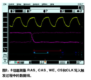 如圖2所示16條邏輯定時(shí)信道用來設(shè)置在RAS高、CAS低、WE高和CS上觸發(fā)系統(tǒng)。示波器信道1用來察看和抽換法時(shí)鐘的上升沿。在邏輯分析儀和示波器組合解決方案中邏輯分析儀只能交叉觸發(fā)示波器或反之與此不同混合信號(hào)示波器可以在示波器和邏輯定時(shí)信道中進(jìn)行全寬觸發(fā)。