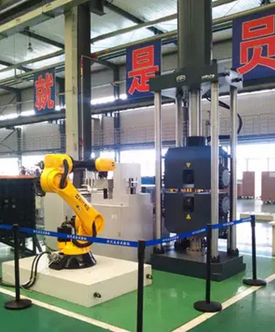 2000kN全自動微機控制電液伺服拉力試驗機是目前國內(nèi)最為先進的自動化試驗系統(tǒng)應用了80kg六自由度機器人、平推夾具、全自動引伸計、尺寸測量平臺等,各部分全部由我公司自主研發(fā)。在整機測控系統(tǒng)的協(xié)調(diào)控制下實現(xiàn)試樣錄入與管理自動送料、測量試樣尺寸、裝夾試樣、自動完成拉伸試驗自動測量控制各種信號試驗數(shù)據(jù)自動分析及上傳自動檢測與處理各種狀態(tài)及異常從而實現(xiàn)中厚板試樣的無人值守批量全自動試驗?刹婚g斷、高精度地完成批量試樣的材料力學性能測試。